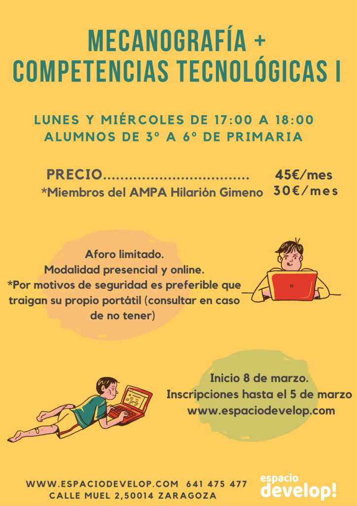 MECANOGRAFÍA + COMPETENCIAS TECNOLÓGICAS I  Todos los lunes y miércoles de 17:00 a 18:00. Modalidad presencial y online. Aforo limitado. Por motivos de seguridad es preferible que traigan su propio portátil (si no es posible consultarnos). Precio 45€/mes* Miembros del AMPA Hilarión Gimeno 30€/mes ¿Qué vamos a aprender? COMPETENCIAS TECNOLÓGICAS Manejo básico de windows y …
